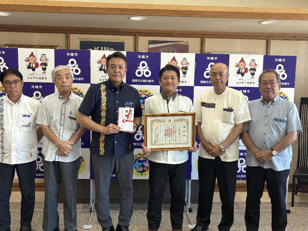 中部興産株式会社では、2025年10月1日に沖縄市役所を訪問し、「沖縄市育英会」へ50万円を寄付させていただきました。