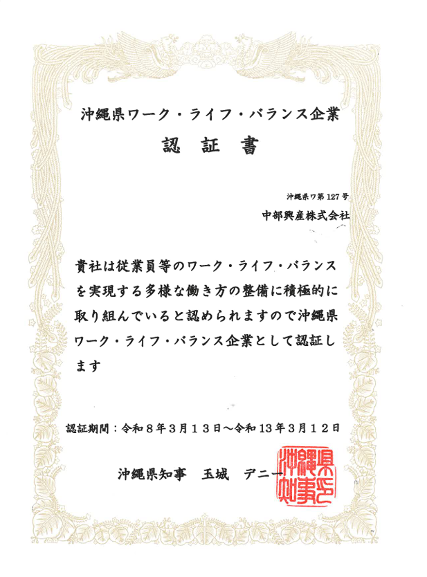 この度、中部興産株式会社は、沖縄県より「沖縄県ワーク・ライフ・バランス企業認証制度」に認証されました。