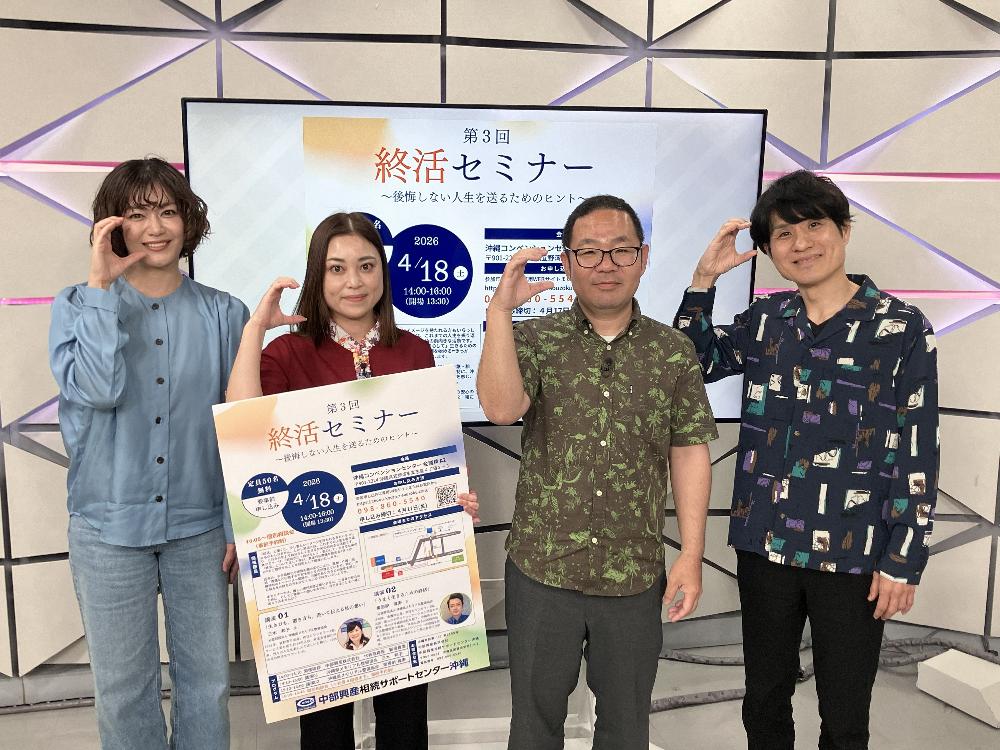 お知らせ 【TV放送のお知らせ】4月6日(月)琉球朝日放送「キャッチー」に出演します お知らせ NEWS ホームお知らせ【TV放送のお知らせ】4月6日(月)琉球朝日放送「キャッチー」に出演します 2026.04.06 ニュース 【TV放送のお知らせ】4月6日(月)琉球朝日放送「キャッチー」に出演します 2026年4月6日琉球朝日放送「キャッチー」で、「相続対策無料セミナー」が紹介されます。放送日時:2026年4月6日(月)16:15~番組名:琉球朝日放送「キャッチー」内の1コマ内容:「相続対策無料セミナー」の紹介 一覧へ戻る CATEGORY ニュース 採用情報 ARCHIVE 2026 2025 2024 2023 2022