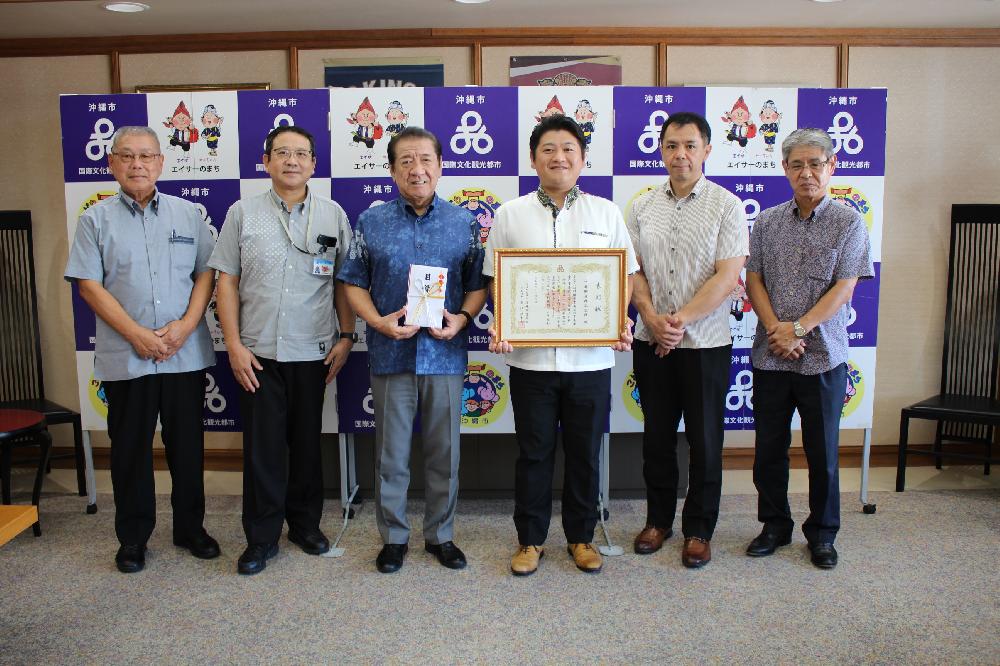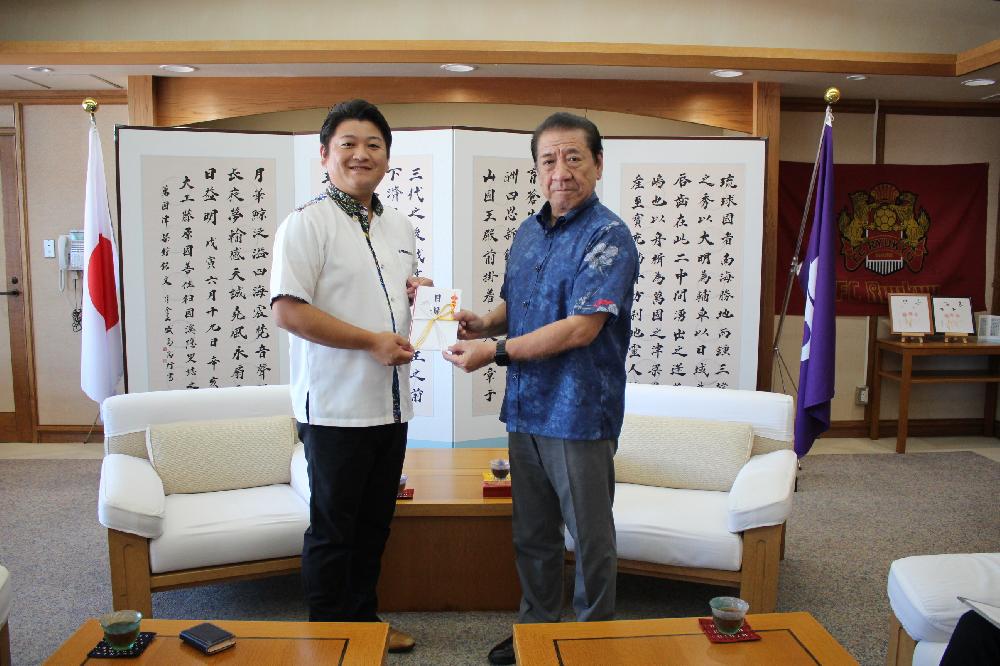 中部興産㈱では、2023年11月6日(月)に沖縄市役所を訪問し、「沖縄市育英会」へ100万円を寄付させていただきました。