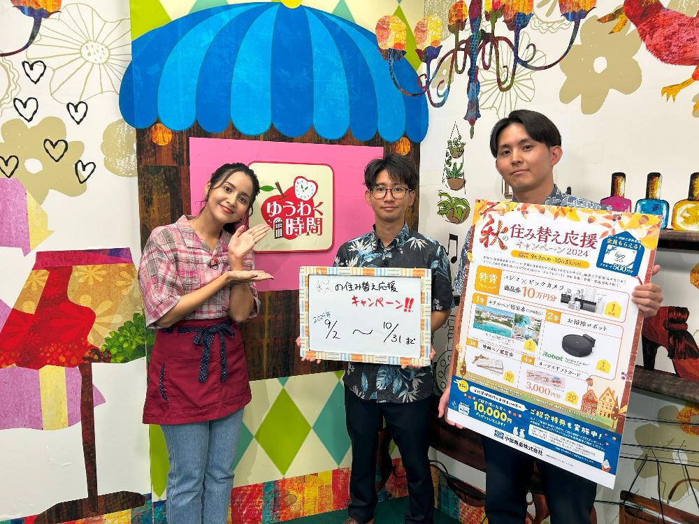 お知らせ 【TV放送のお知らせ】9月11日(水)琉球放送「ゆうわく時間」に出演します お知らせ NEWS ホームお知らせ【TV放送のお知らせ】9月11日(水)琉球放送「ゆうわく時間」に出演します 2024.09.03 ニュース 【TV放送のお知らせ】9月11日(水)琉球放送「ゆうわく時間」に出演します 2024年9月11日琉球放送「ゆうわく時間」で、「秋の住み替え応援キャンペーン」が紹介されます。放送日時:2024年9月11日(水)13:55~番組名:琉球放送「ゆうわく時間」内の1コマ内容:「秋の住み替え応援キャンペーン」の紹介 一覧へ戻る CATEGORY ニュース 採用情報 ARCHIVE 2026 2025 2024 2023 2022